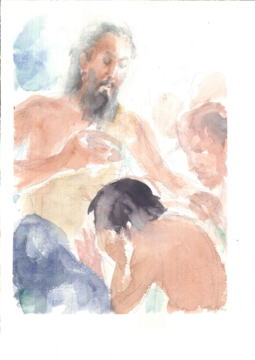 Giovanni battezza nel Giordano, acquarello di Maria Cavazzini Fortini, dicembre 2015