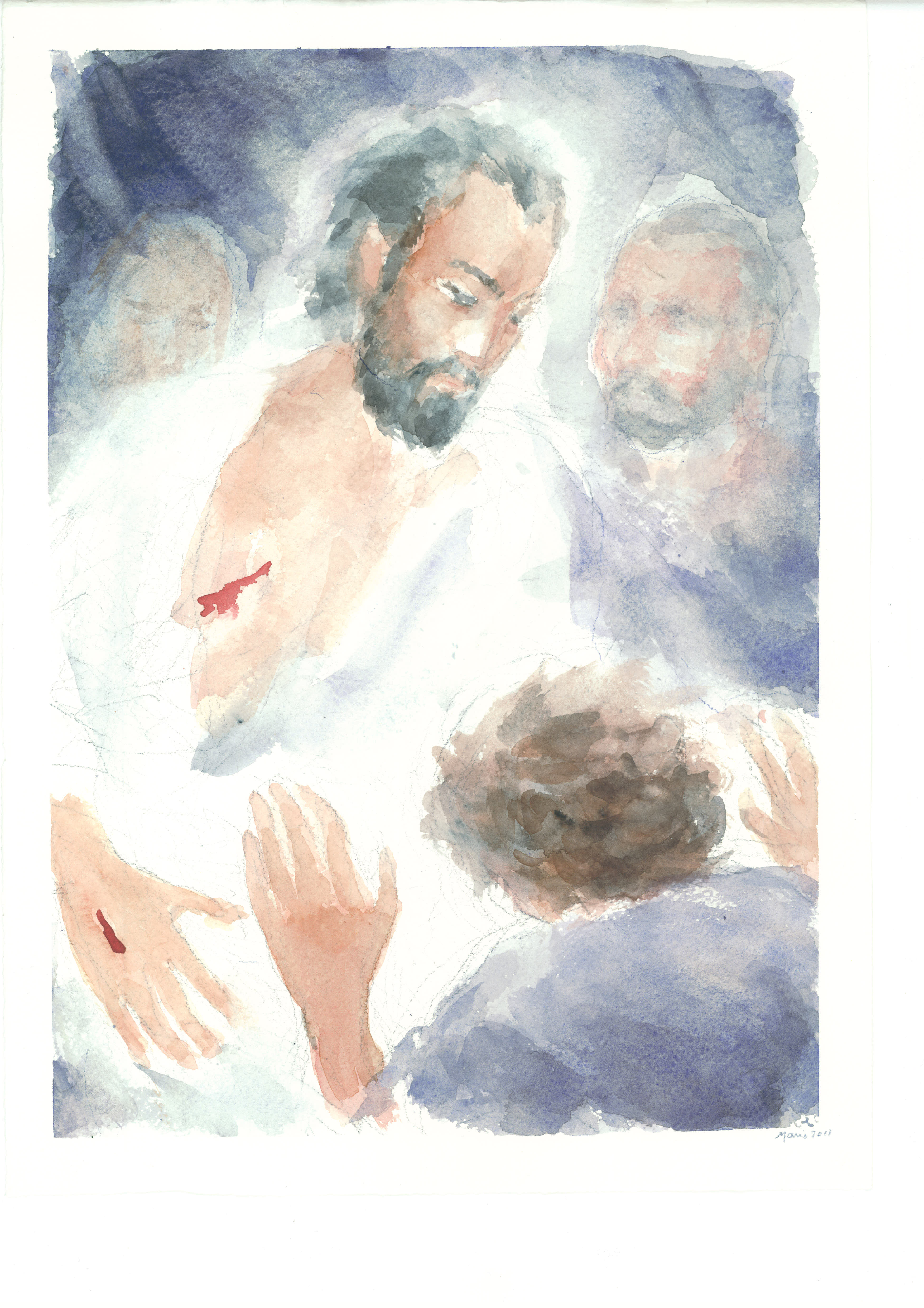 Tommaso non si lascia contagiare dalla gioia che poco a poco ha sostituito la paura nei suoi fratelli, ma vi si oppone dicendo: “se non vedo nelle sue mani il segno dei chiodi, e non metto il mio dito nel segno dei chiodi…” (Gv 20,25). Tommaso non ha amore e fede sufficiente in sé per credere, e non potrebbe essere altrimenti, ma in tutta sincerità viene fuori allo scoperto. In realtà, quando facciamo venire allo scoperto chi siamo e cosa veramente sentiamo, diventiamo un grido di preghiera, attiriamo la Misericordia Divina a soccorrerci e a compiere in noi, ancora una volta, il miracolo di tutti miracoli: “mio Signore e mio Dio!..” (Gv 20,28) ovvero a generare in noi, “la vittoria che vince il mondo: la nostra fede” (1Gv 5,4). Nel luogo delle piaghe del corpo di Gesù, Tommaso voleva metterci il dito. Il Signore gli viene incontro invitandolo a mettercelo. Anche noi siamo invitati a tendere la nostra mano e a mettere il nostro dito lì, nel posto dove Lui si fa toccare e dove noi veniamo toccati da Lui: miseria e Misericordia, faccia a faccia, possono vivere insieme felici!